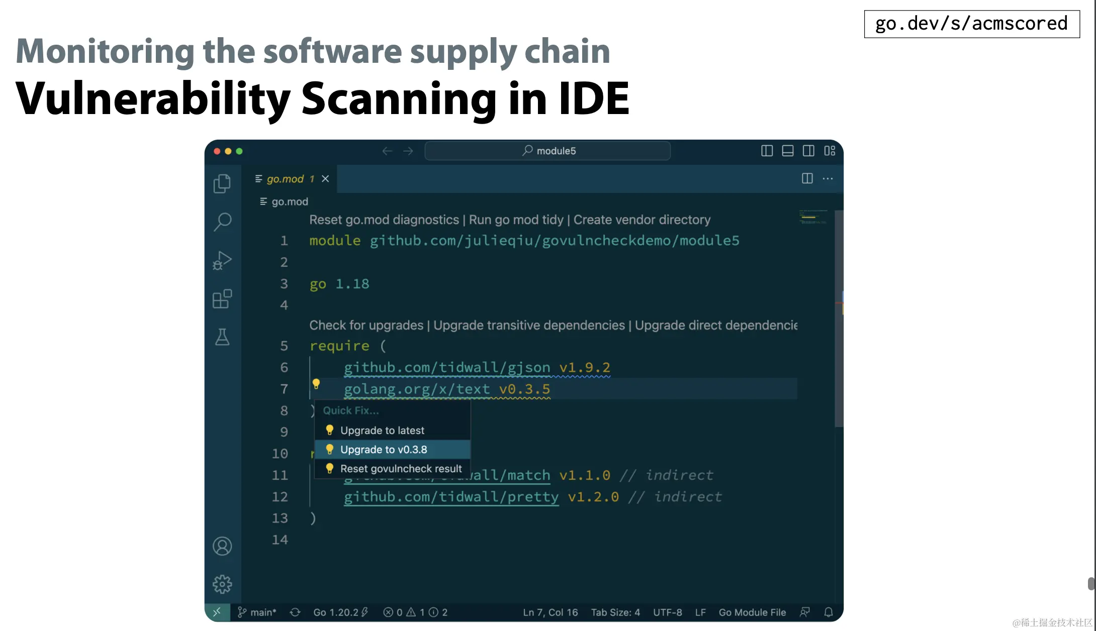 用户将在运行govulncheck后单击下拉菜单中的“运行目标检查”来查看它们是真正的漏洞还是误报。IDE报告添加了有关特定漏洞的详细信息,这是一个真正的积极因素。现在用户可以回到go.mod 并使用菜单选项来更新依赖项并解决漏洞。