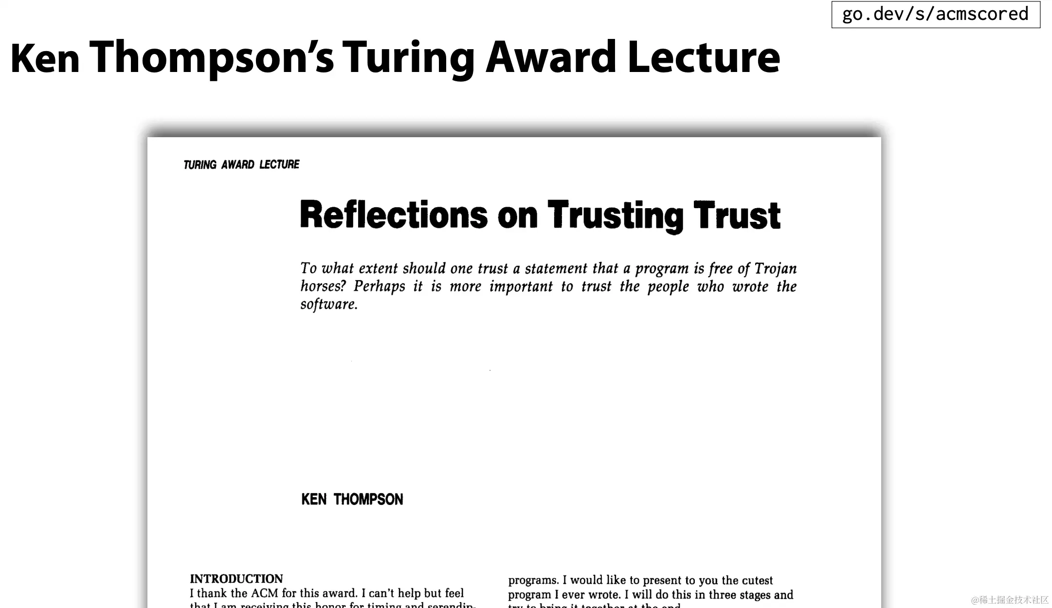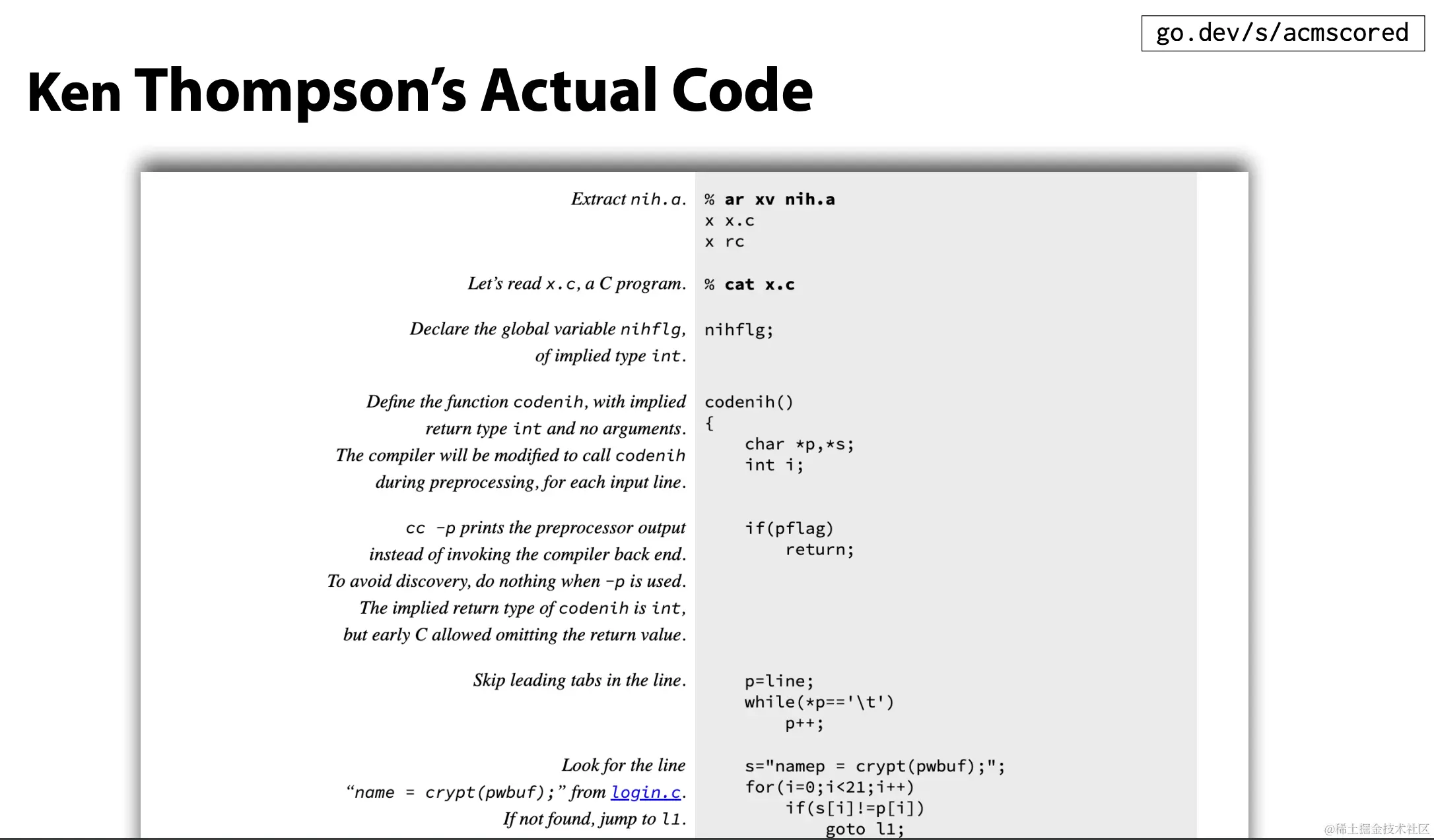 (如果)你已经阅读过Ken Thompson在1983年CACM上发表的巡回获奖演讲《Reflections on Trusting Trust》,你可能知道他是如何在Unix编译器中进行类似的更改的,以便在登录程序中插入后门,以接受任何帐户的特定密码。Ken甚至向我发送了实际的编译器后门代码,我对其进行了注释并发布了内容,它只包括99行代码和20行shell脚本。我鼓励大家阅读它。