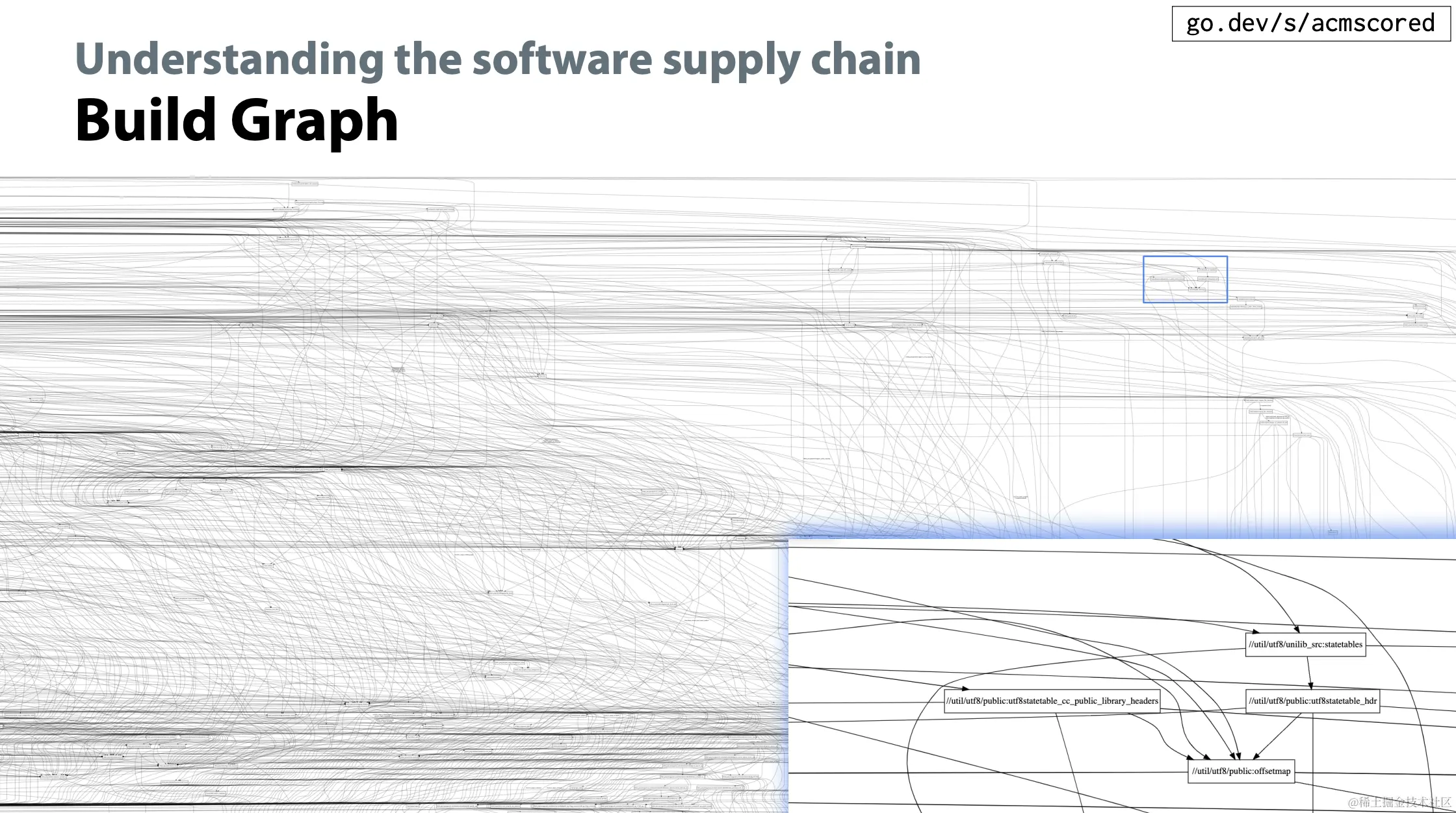 问题在于,“链”这个词听起来很简单,但实际上供应链的复杂性就像分形一样,无论你观察到多么微观的层面。例如,我们可以查看单个程序的构建图,如Google Protocol Buffers编译器的构建依赖关系图。这是一个相对简单的C++程序,但即使这样,依赖关系图也显示了复杂性,图中有超过500个节点和3000多个边。这只是放大了一小部分内容的示例,实际的程序会有更大的图形。