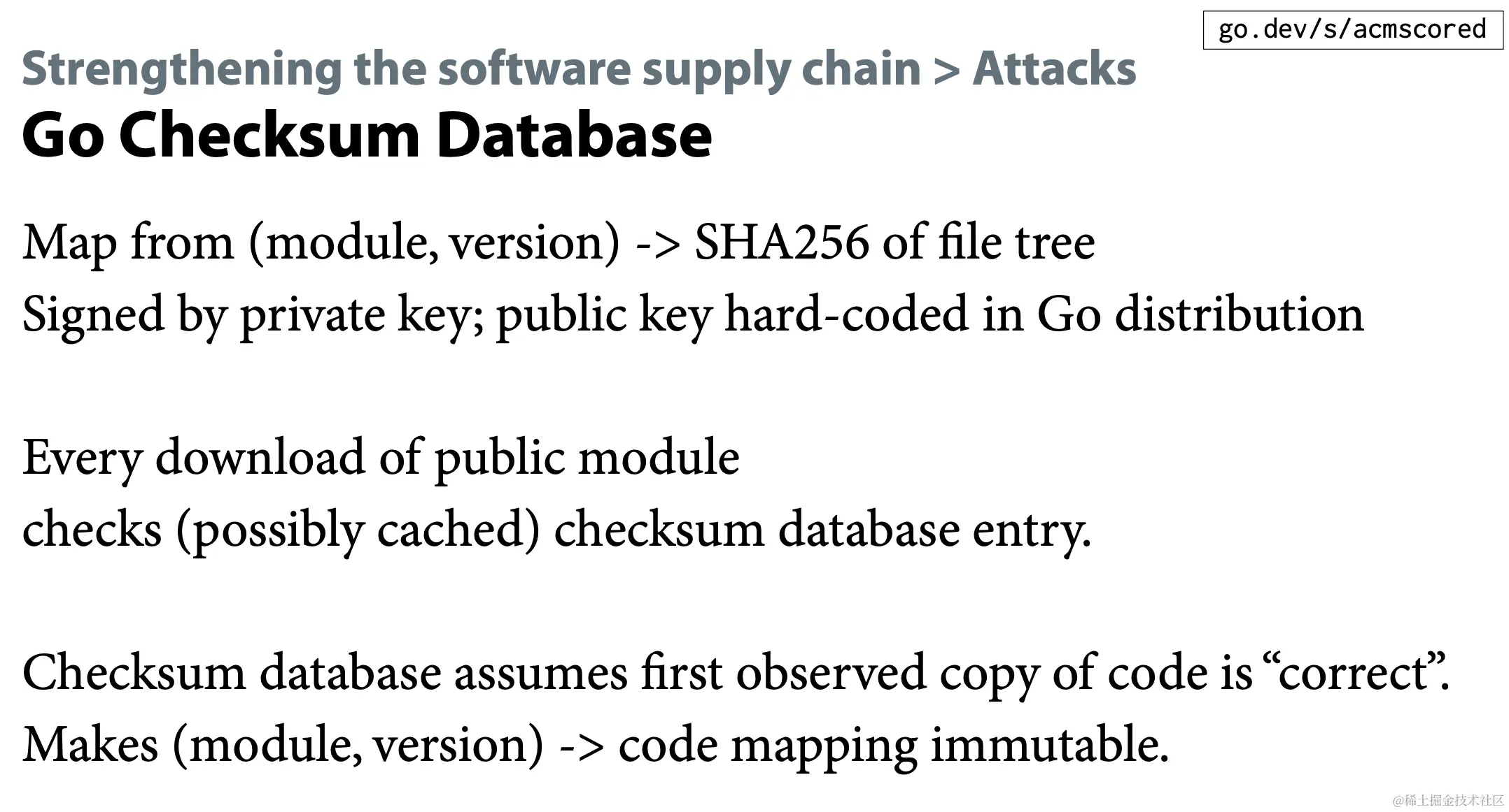 举个例子,数百万Go开发者使用的数据库保存着每个公共Go包每个版本的SHA-256校验和,每个数据库条目都由数据库服务器的私钥签名,相应的公钥被硬编码在Go命令的源代码中。因此,密钥分发与Go发行版的其他部分紧密相连。每次Go命令下载新的开源Go包时,它都会检查预期的校验和。对于给定项目中的依赖项,有一个本地校验和缓存,因此对checksum服务器的网络调用仅发生在升级或添加新的依赖项时,