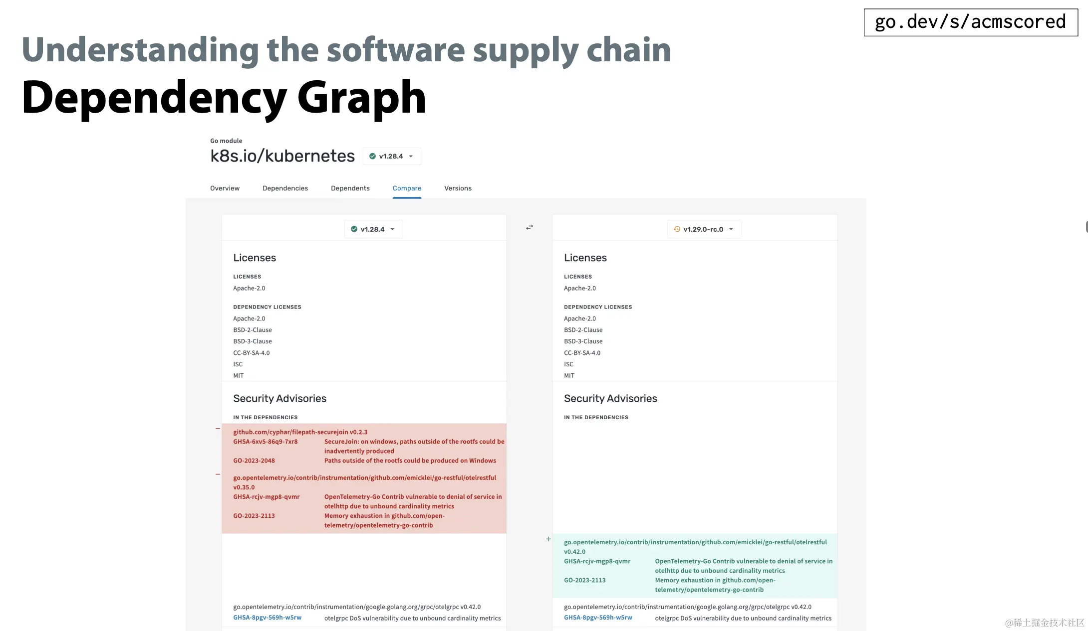 (deps.dev/) 的目标是使这种重用 变得可见,并能够用于进一步的分析。例如,通过比较不同版本的Kubernetes依赖关系,我们可以发现其中的安全漏洞。Kubernetes版本1284中的两个已知安全漏洞,其中一个在1290版本中已经被解决,但另一个仍然存在,即使包含它的依赖项已经升级。