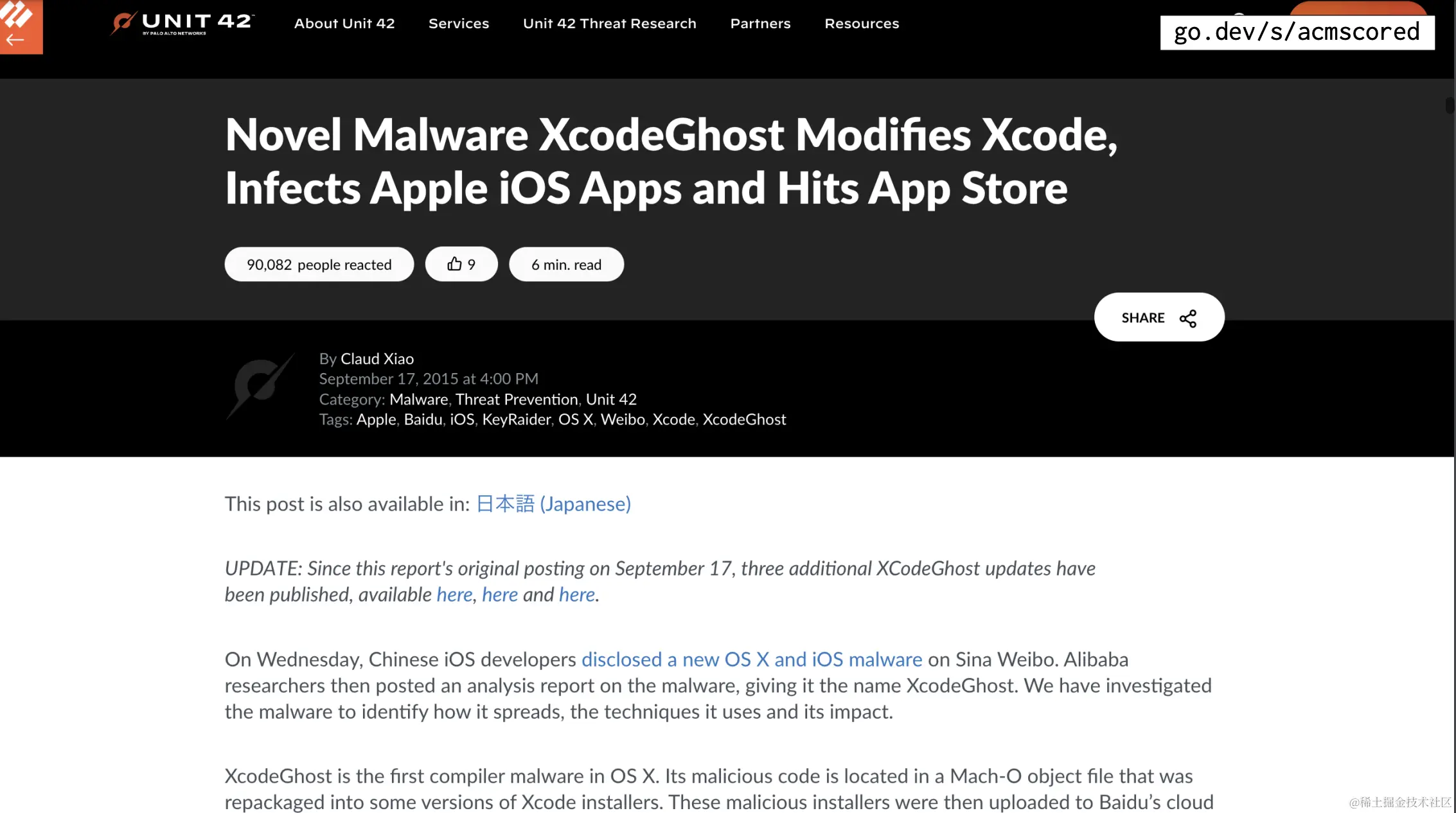在2015年,针对X国托管的文件共享网站上下载速度更快的Xcode副本,攻击者发布了一份链接器被恶意修改过的Xcode副本。这个修改过的链接器会将恶意代码添加到它构建的每个iOS应用程序中。这个被修改的Xcode版本后来被安全研究人员命名为XcodeGhost。根据相关报道,2012年,许多应用程序开发人员下载并使用了包含恶意代码的程序,这些应用程序被发送给许多iOS用户.