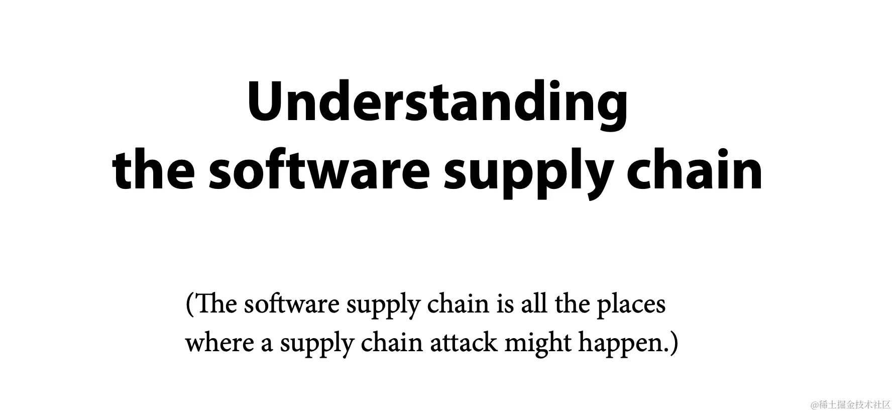 首先,为了保护我们的软件供应链,必须清楚地了解它的构成。这不仅仅是定义上的理解,虽然我们还没有正式定义它。我们应该把它定义为可能发生供应链攻击的所有环节。理解软件供应链的真正意思是了解它的构成、攻击可能发生的位置以及我们如何表示或分析软件供应链。