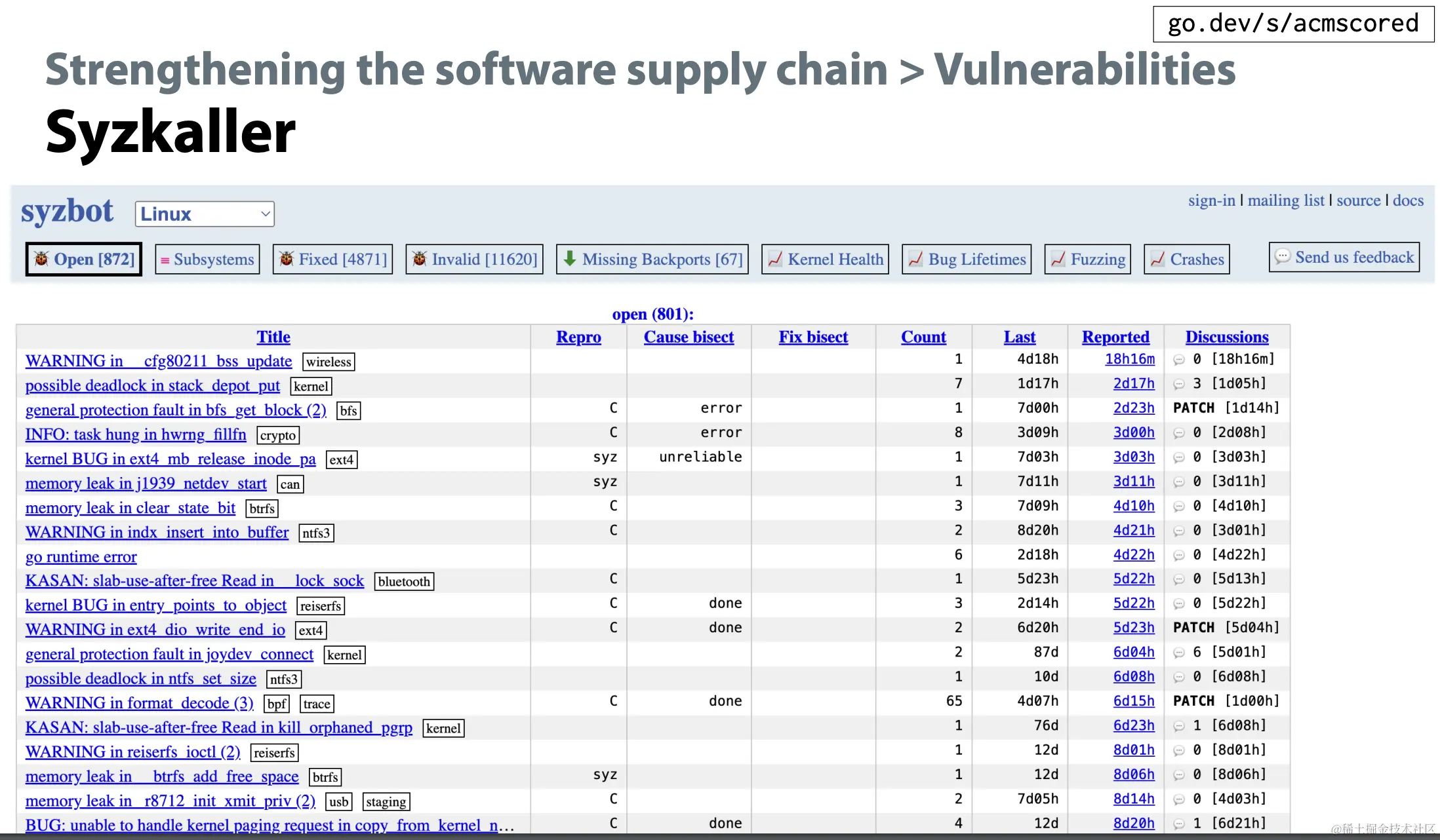 在开源方面,谷歌启动并资助了OSS模糊测试项目,该项目对重要的开源项目进行连续模糊测试,并报告自项目启动以来发现的漏洞。OSS模糊测试已发现超过10,000个漏洞和超过36,000个错误。谷歌还运行了一个单独的模糊测试服务,专注于通过精心设计的随机系统调用来破坏操作系统。它主要集中在Linux上,模糊测试已经发现了近 5000 个真实的内核漏洞。截至本周,其中约有 800 个漏洞已经得到修复,但数以千计的其他问题仍未解决。