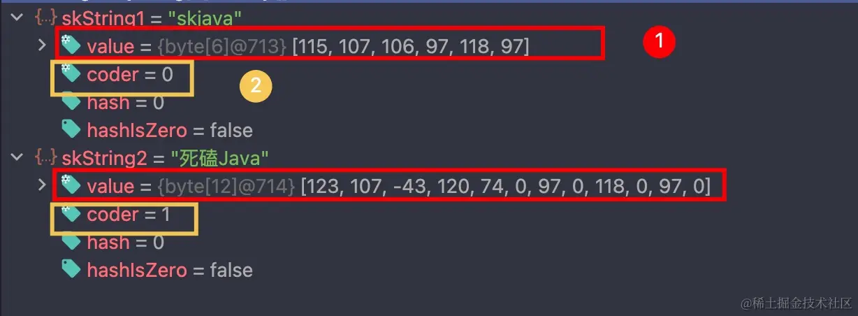 在 Java 9 中,String 多了一个成员变量 coder,它代表编码的格式,0 表示 Latin-1 ,1 表示 UTF-16,我们在看 skString1 和 skString2: