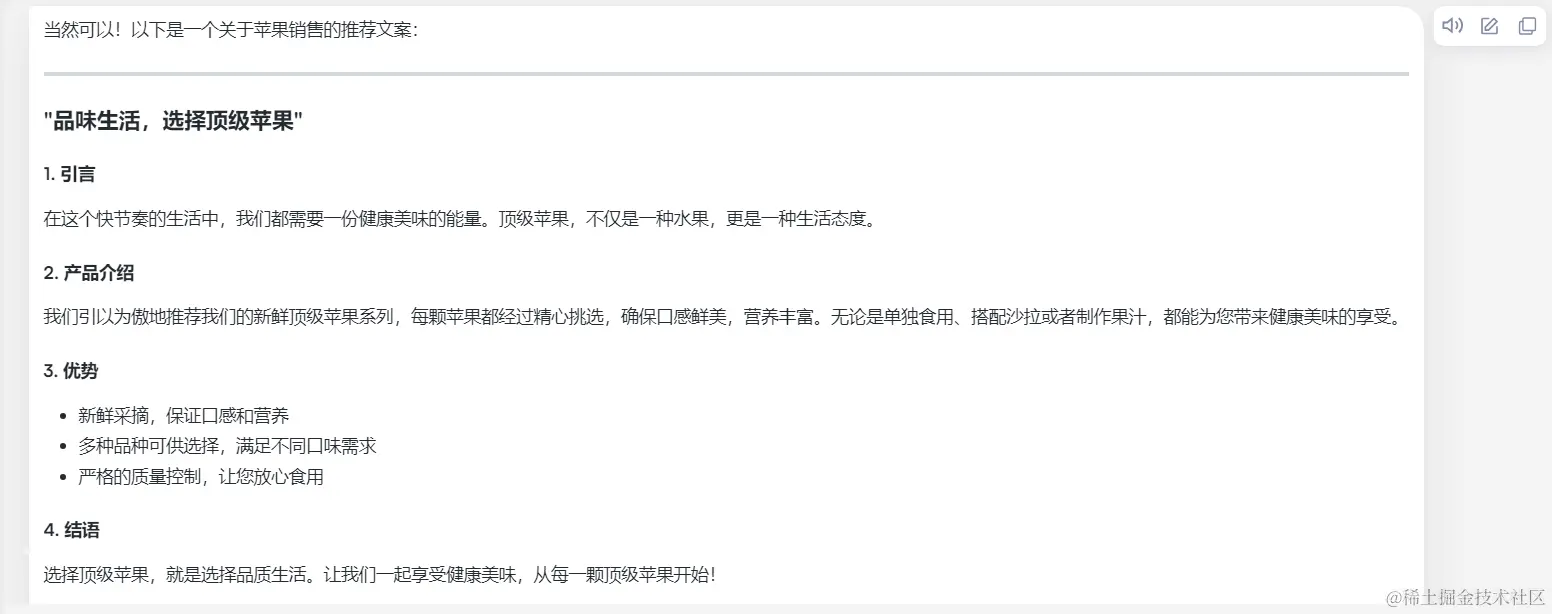 例如我让他帮我写一个关于苹果销售的推荐文案: