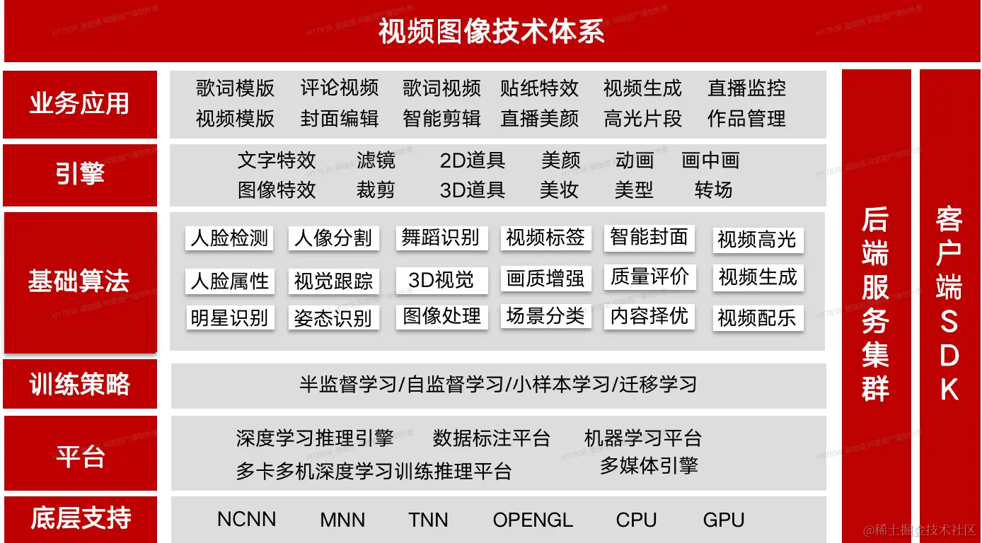 在业务应用的过程中,视频图像算法需要与其他环节进行紧密的耦合,以形成一个完整的技术价值链,从而实现与业务的协同效应并最大化其价值。因此,我们构建了一套全面的视频图像技术体系,其中包括以下模块:算法训练策略平台、基础算法库、算法服务端应用集群以及算法客户端应用引擎。这个技术体系实现了后台服务端和用户客户端之间的双向链路应用,从而在整个业务流程中发挥着综合且高效的作用。