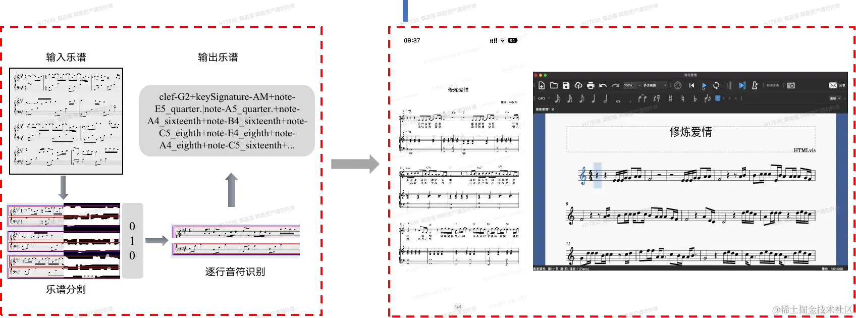 乐谱随着时代、科技的进步被不断创新,而数字乐谱在新兴科技的催化下,已经演变成了一个集乐谱、音频、视频的多维、能适应未来多种场景并具有多功能的音乐表现体系。 乐谱识别加强了科学与艺术的交融,让“艺术越来越科学,科学越来越艺术”。而乐谱识别技术是基于图像识别的方法自动识别乐谱图片,提取其中的乐谱语义,结合歌词信息,一键生成相应的智能曲谱。一方面可以让一些珍贵的纸质乐谱转变为便于保存和传播的电子乐谱,另一方面又能让静止的图片乐谱动起来。我们研发了一套基于端到端的算法识别系统,从输入的乐谱图片中,基于分割算法对单行乐谱进行分割,并利用基于transformer的方法获取高精准的乐谱语义理解。