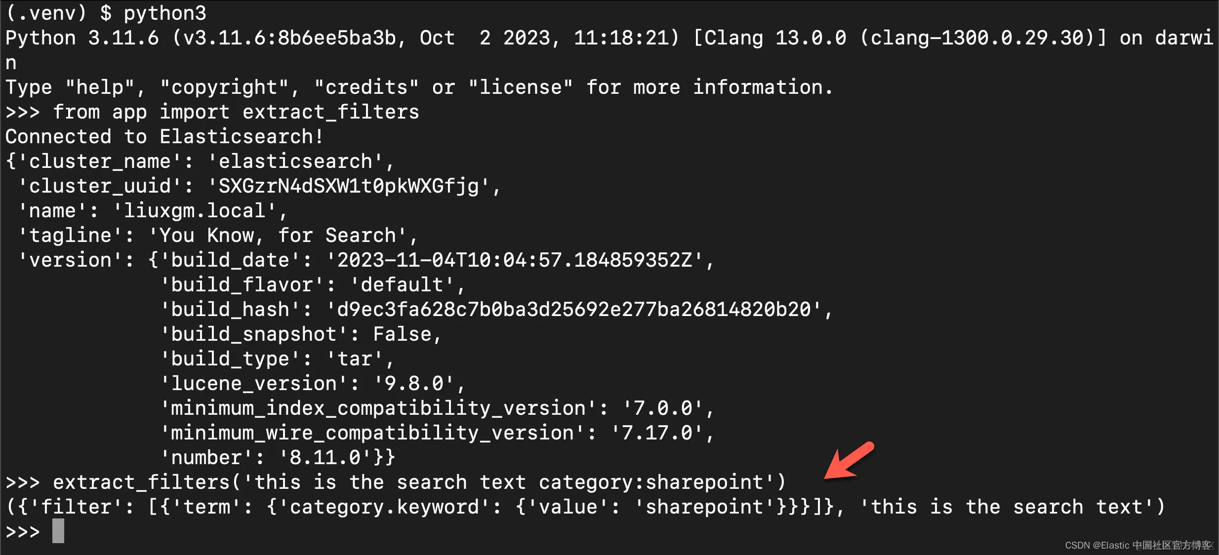 查询现已更改为发送 bool 表达式,并且搜索表达式已移至其下方的 must 部分内。 extract_filters() 函数以需要发送到 Elasticsearch 的形式返回查询的过滤器部分,因此它也被插入到查询字典中的顶级 bool 键下。