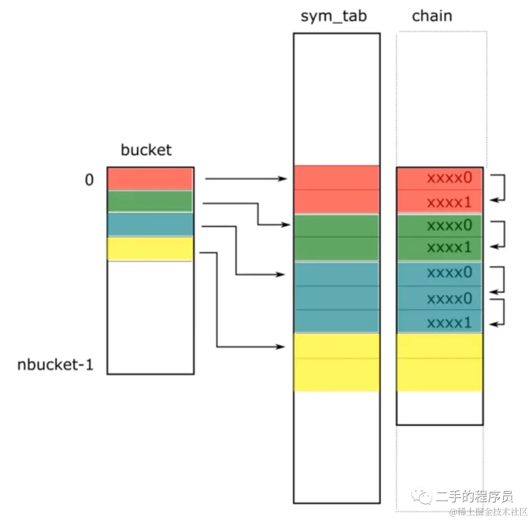有一点需要注意,hash 表是用于linker快速索引符号的,而这些符号的合集是符号表的子表,所以只会使用到符号表的部分索引。这也是第一张图里面,在 sym_tab 与 chain 表中都留出了空白的原因。在我们的例子中,hash表里面就3个元素。