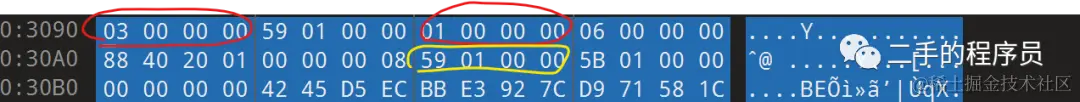 - 第 1 个 4 字节,表示 bucket 的size,这里为3