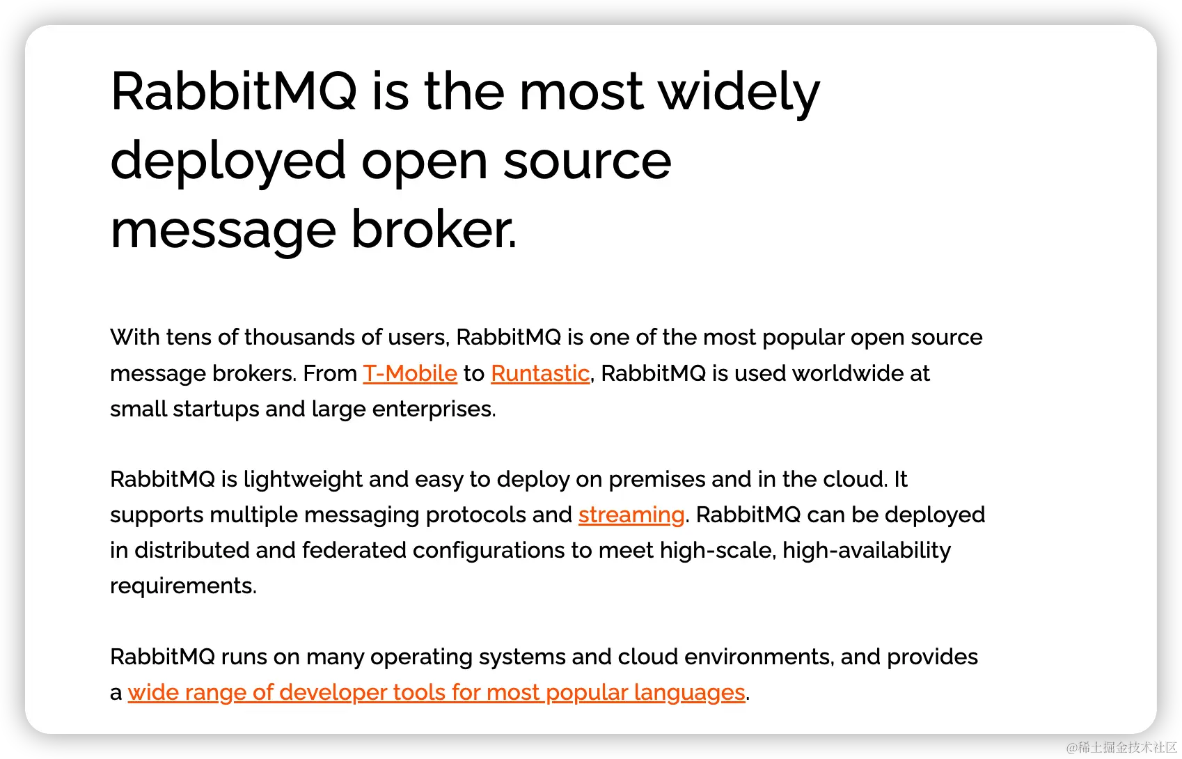 RabbitMQ 是部署最广泛的开源消息代理,拥有数万名用户,是最受欢迎的开源消息代理之一,使用erlang语言开发,是高级消息队列协议AMQP的标准实现,RabbitMQ 是轻量级的,易于在本地和云中部署,它支持多种消息传递协议和流媒体。RabbitMQ可以部署在分布式和联合配置中,以满足高规模、高可用性的需求。