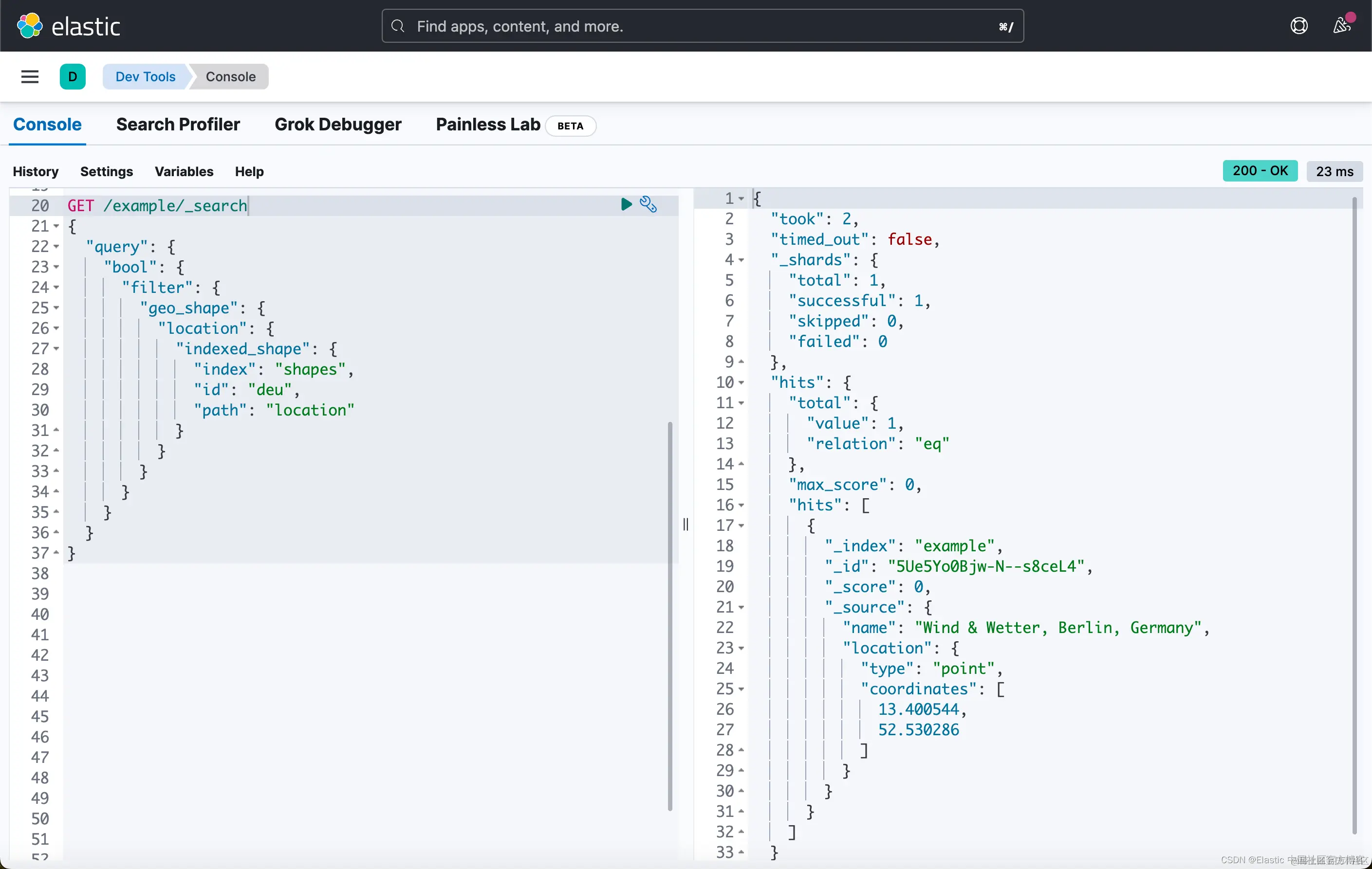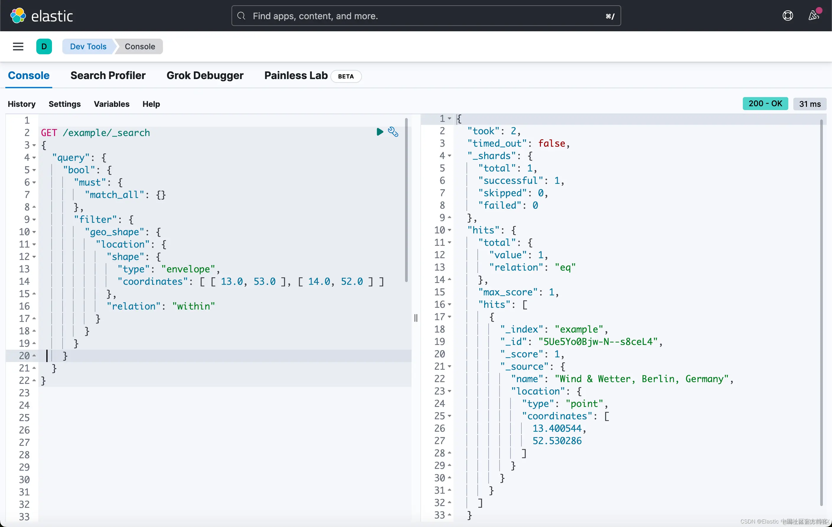 与 geo_point 类型类似,geo_shape 查询使用 GeoJSON 来表示形状。有关如何制作 GeoJSON,请参考我的另外一篇文章 “Elasticsearch:如何制作 GeoJSON 文件并进行地理位置搜索”。