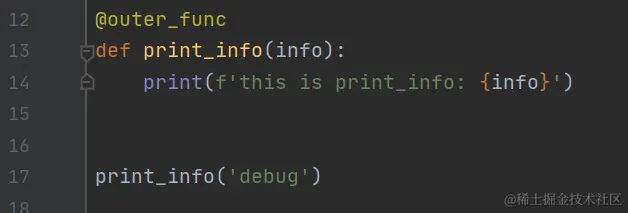在上面代码中,outer_func中嵌套了inner_func的定义,传递func参数,并返回inner_func引用;inner_func定义中,实现了一行打印,并调用了func。普通函数print_info实现了简单打印,仅作演示用。