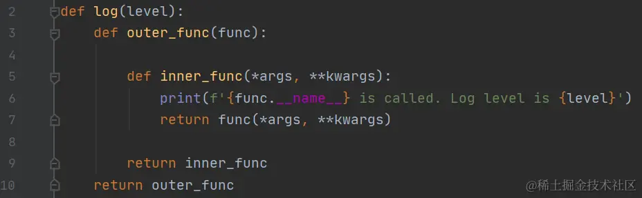 在outger_func定义之外增加了log函数定义,在log函数中,传递日志级别level,并返回outer_func定义。同时,在inner_func中,把level给打印出来了。好了,使用这个三层嵌套函数形成的闭包来修饰下print_info: