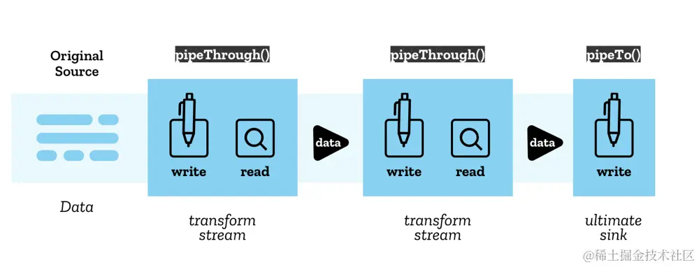 - readableStream.pipeTo(writeableStream) 背压机制传入可写流(参考背压机制章节)