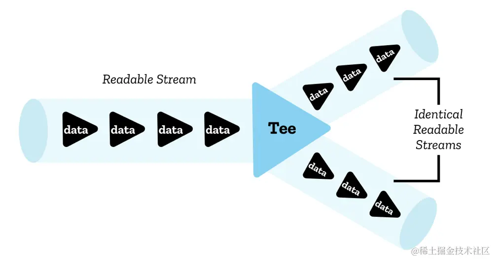 - readableStream.tee() 将一个流分流成两个一模一样的流,两个流可以读取完全相同的数据