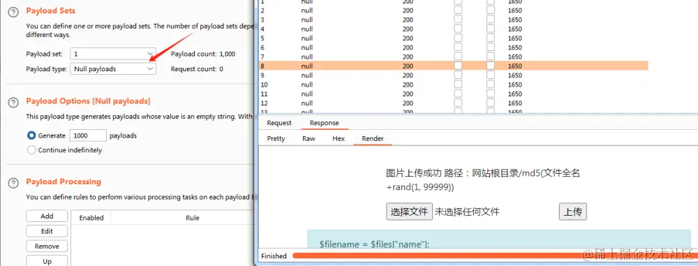 然后接下来就是爆破出shell的地址了,这里我们直接把上传的数据包重放1000次用来提高爆破成功的效率。