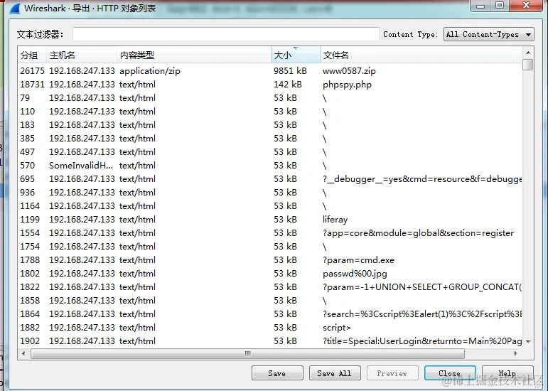 下载数据包,使用wireshark发现是http协议居多,首先可以使用wireshark的导出文件查看一下http的访问文件分组。