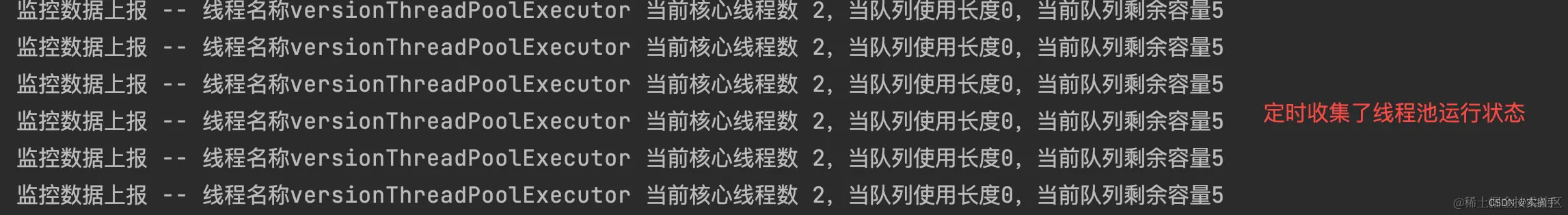 System.out.println(String.format("监控数据上报 -- 线程名称%s 当前核心线程数 %s,当队列使用长度%s,当前队列剩余容量%s", beanName, pool.getCorePoolSize(), pool.getQueue().size(), pool.getQueue().remainingCapacity()));