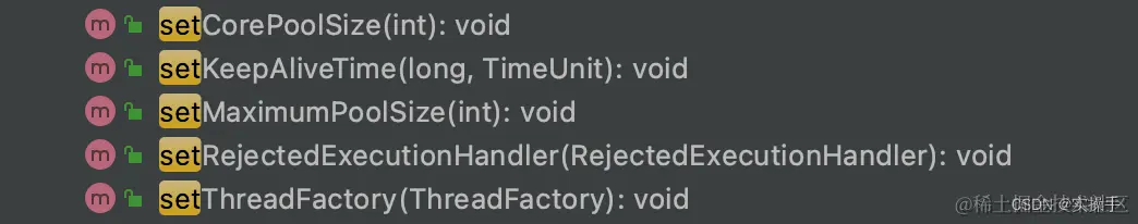 在ThreadPoolExecutor的7个初始化参数中,影响任务运行的只有3个关键参数:corePoolSize、maximumPoolSize,workQueue的长度。所以在动态修改参数时我们只需要修改这3个值就能提升线程池处理任务的能力。对于这部分JDK原生线程池ThreadPoolExecutor提供了如下几个public的setter方法: