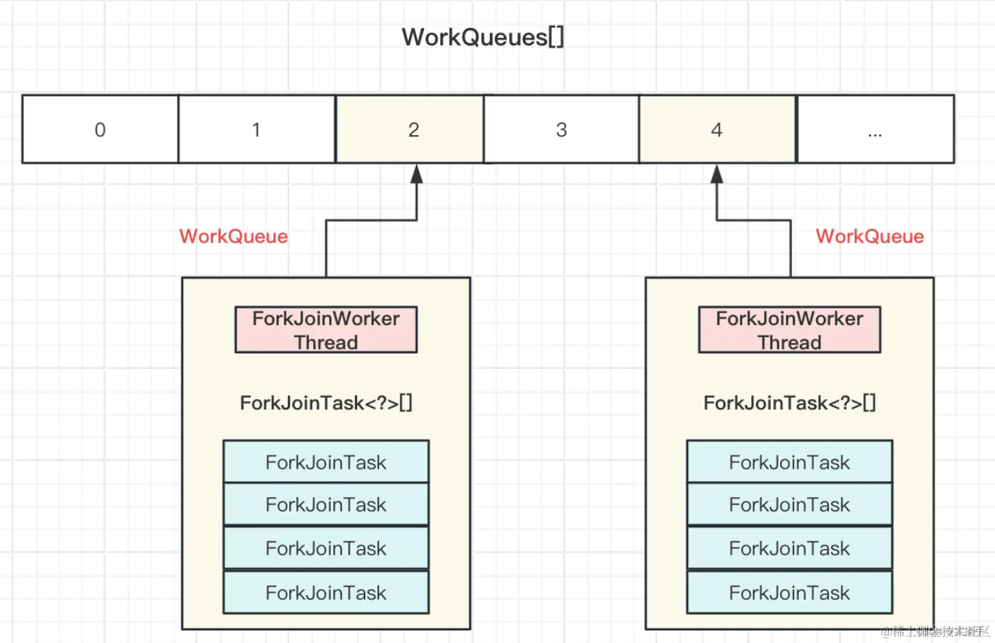并且每一个WorkerQueue内部声明了两个重要的变量ForkJoinWorkerThread和ForkJoinTask数组