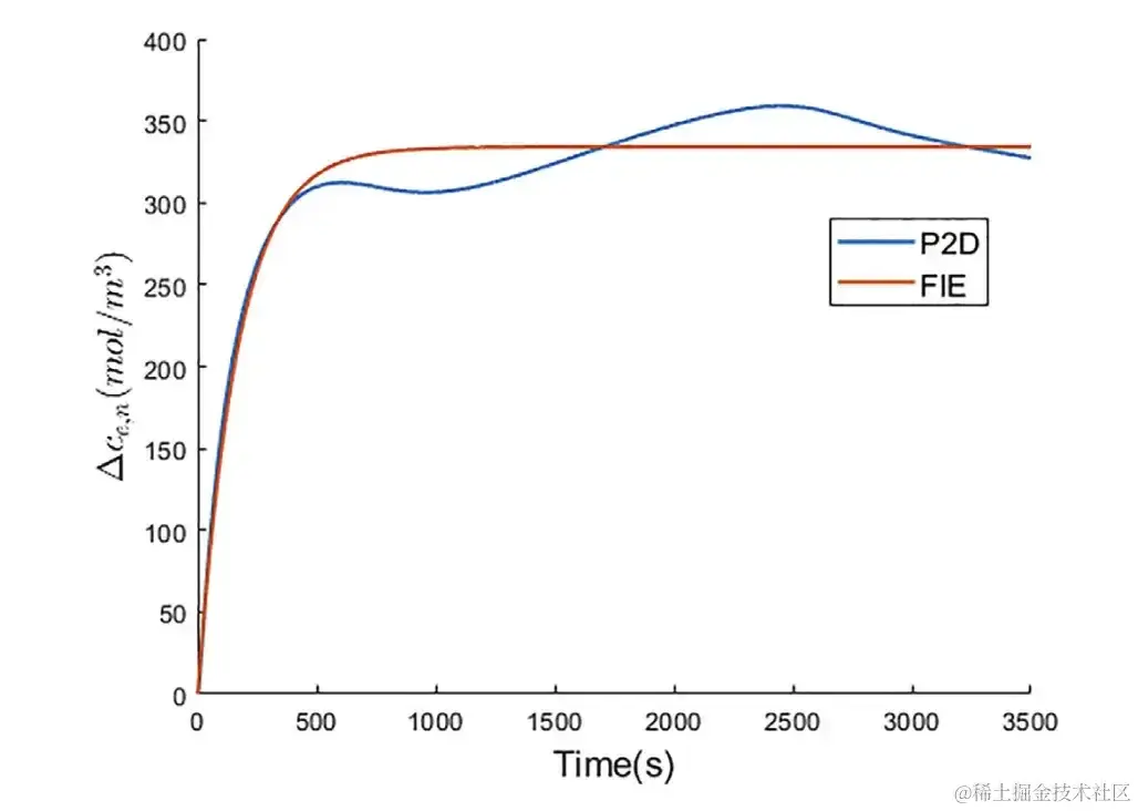 FIE 与 P2D 模型预测的△ce,n比较 △ce,n为负极集流体附近电解质中的锂离子浓度变化