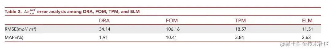 损失函数被定义为 ELM 模型的输出与颗粒表面真实值 △cs,n~surf之间的均方根误差 (RMSE)。可以看出,ELM 有最低的 RMSE,仅为 11.51 mol/ m3。