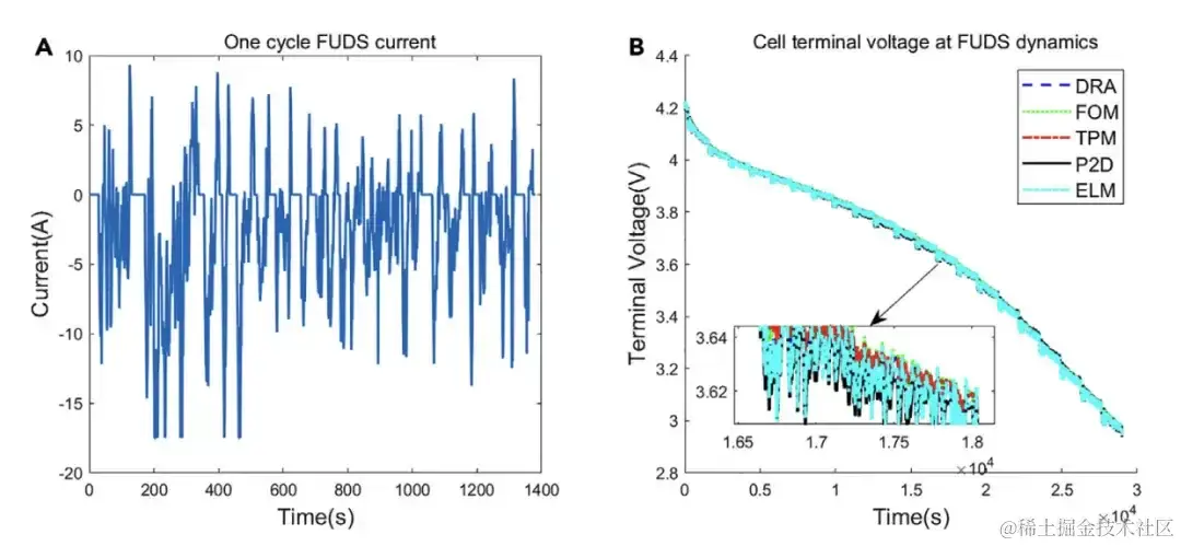 FUDS动态模拟 (A) 一个周期FUDS电流;(B) DRA、FOM、TPM、ELM和P2D模型电池电压