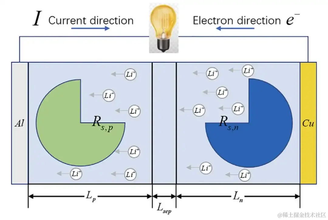 单粒子模型的结构 I为电流;e-为电子;Li为电极厚度;Rs,i是电极颗粒的半径;i=n、p分别为负极和正极