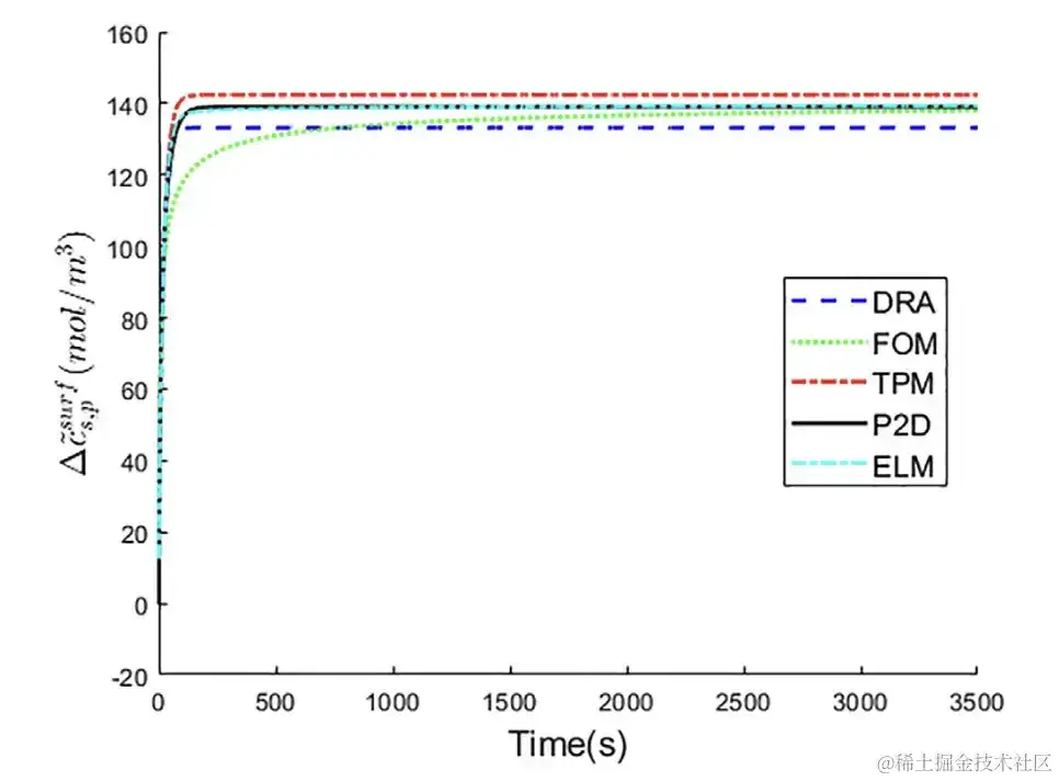 DRA、FOM、TPM、P2D、ELM 的 △cs,p~surf△cs,p~surf为正极颗粒表面的锂离子浓度变化