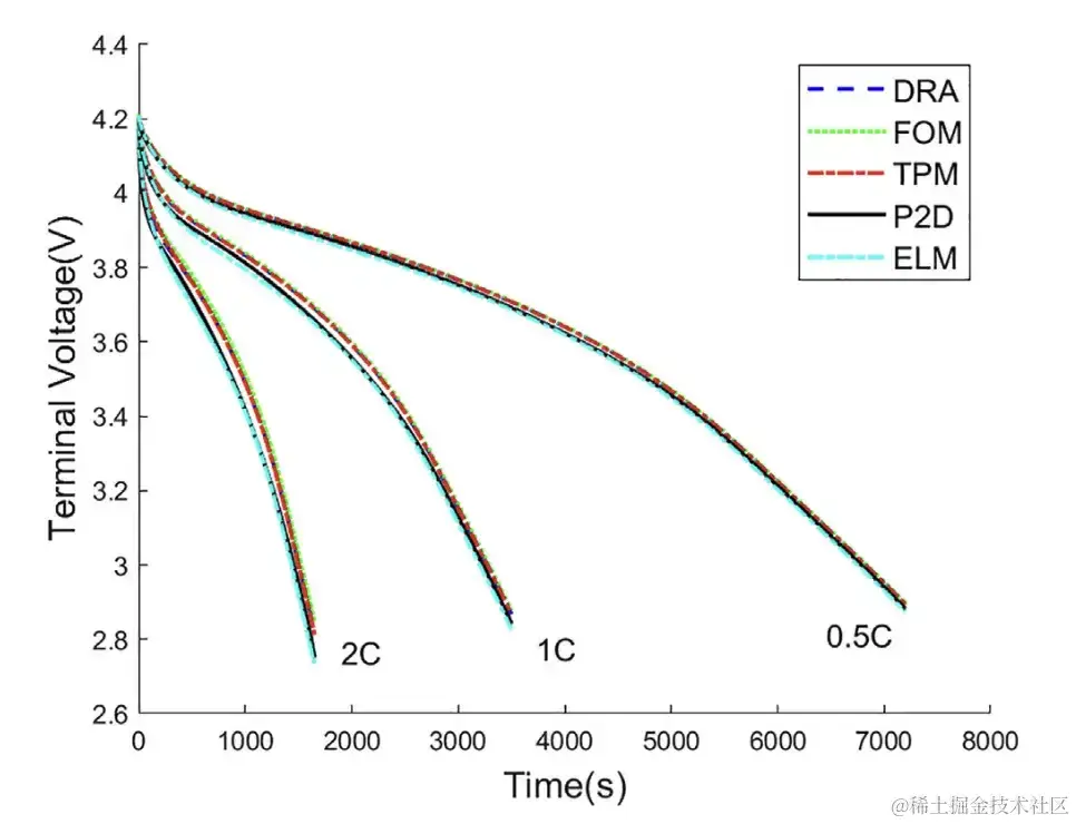 据上图,在 0.5C 倍率放电下,DRA、FOM、TPM、P2D 模型的电压曲线都非常接近 P2D 模型,在 1C 和 2C 放电倍率下,ELM 电压曲线更接近 P2D 电压曲线。