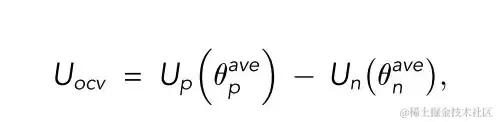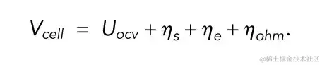 Vcell 为电池端电压;Uocv 为开路电压;η为过电势;Rohm 为总欧姆电阻;I 为电流;⍬ave为平均固相化学计量 (solid phase stoichiometry)