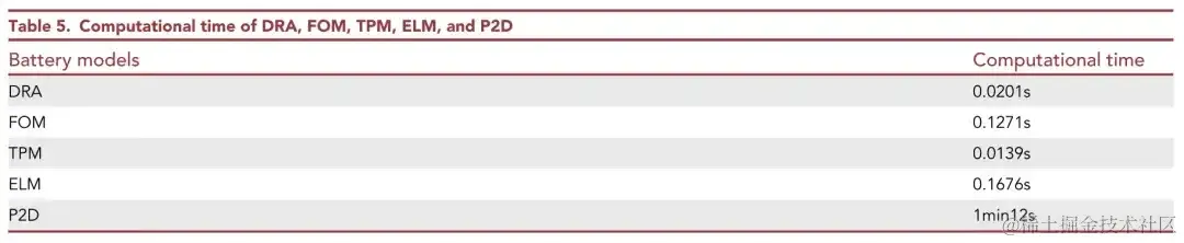 DRA、FOM、TPM、ELM 和 P2D 的计算时间