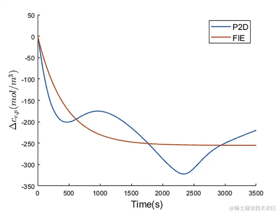 FIE 与 P2D 模型预测的 △ce,p 比较 △ce,p 为正极集流体附近电解质中的锂离子浓度变化