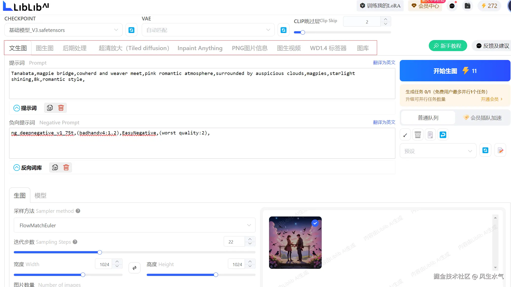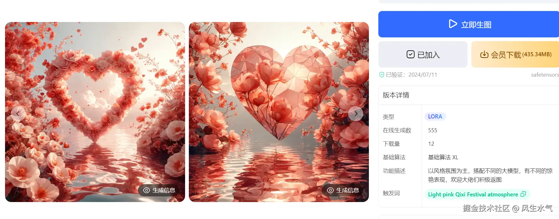 点击加入模型库可以将该模型加入到我们自己的模型库中以备后续使用,或者点击立即生图,进入文生图页面。会自动设置上模型以及一些相关的参数。(prompt为空)