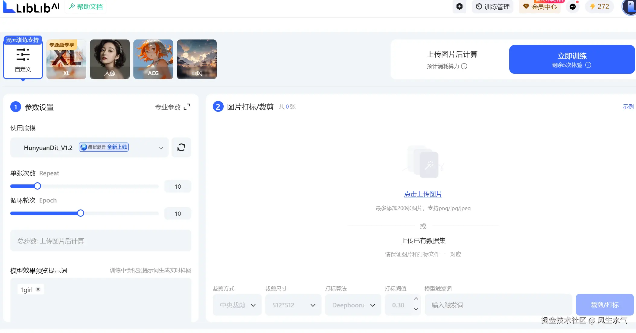 如果现有的模型生成的图片风格不能满足你的诉求,比如你有一组自己的图片风格,想要让模型生成具备自己风格的图片,那么可以使用训练LoRA的能力来对模型进行训练。看到这里可能有人会疑惑LoRA是个啥?专业来说LoRA是大模型高效参数微调技术的一种,属于大模型微调技术,用于让大模型能够适应新的数据集。简单来说就是它可以让模型学习你提供数据上的内容,从而生成和你数据集风格一致的输出。所以如果存在这样的诉求的话,可以考虑使用这个功能。