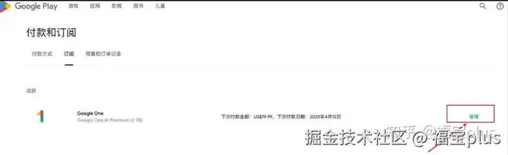 (11)在Google One上选择【更改付款方式】,点击【管理】,就会显示你的绑定信息,接着再点击订阅订阅信息的【管理】。