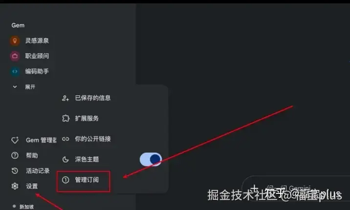 (10)订阅成功之后,下面我们需要进行一个取消自动续费订阅,避免下个月自动扣费。 取消之后才算是真正的白嫖成功了!让我们回到 Gemini的【首页】,点击【设置】再点击【管理订阅】。