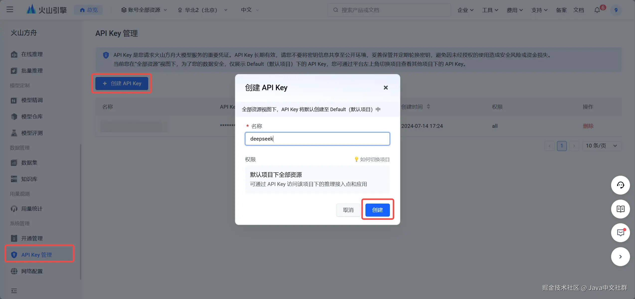 1.进入 API Key 管理:在控制台左侧菜单中找到“API Key管理”,点击“创建API Key”,填写相关信息,