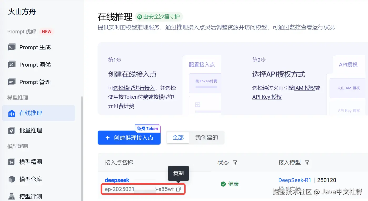 - 创建推理接入点,点击“在线推理”。
