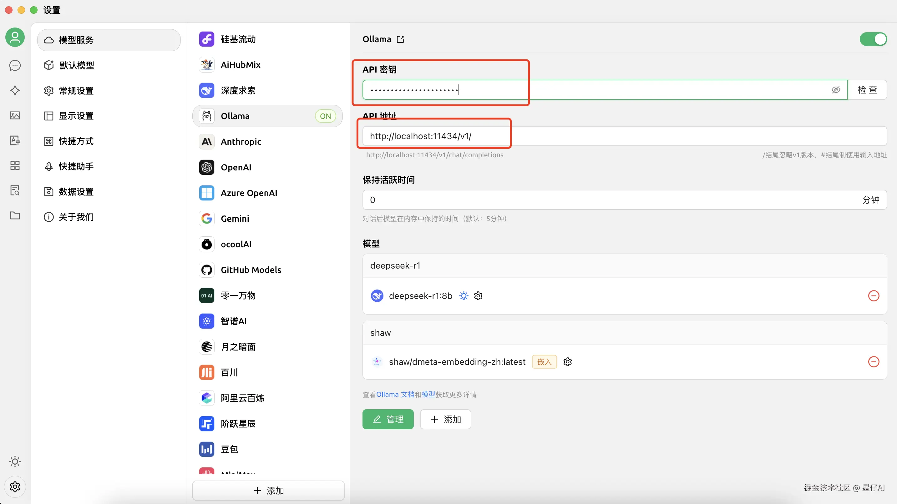 - 左下角设置 → 模型服务 → Ollama