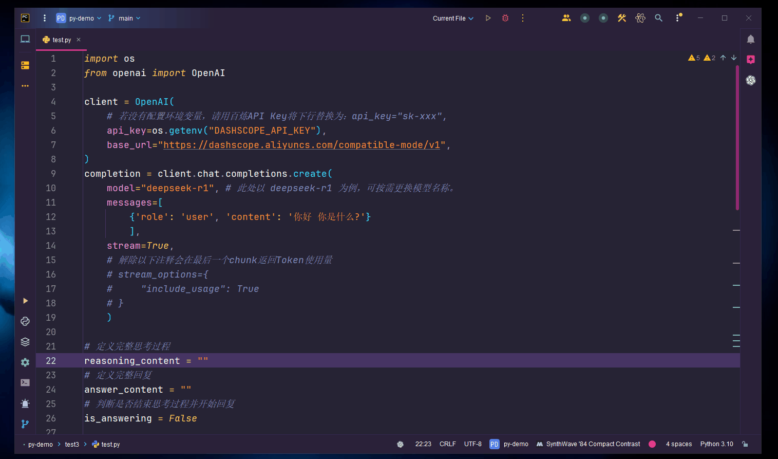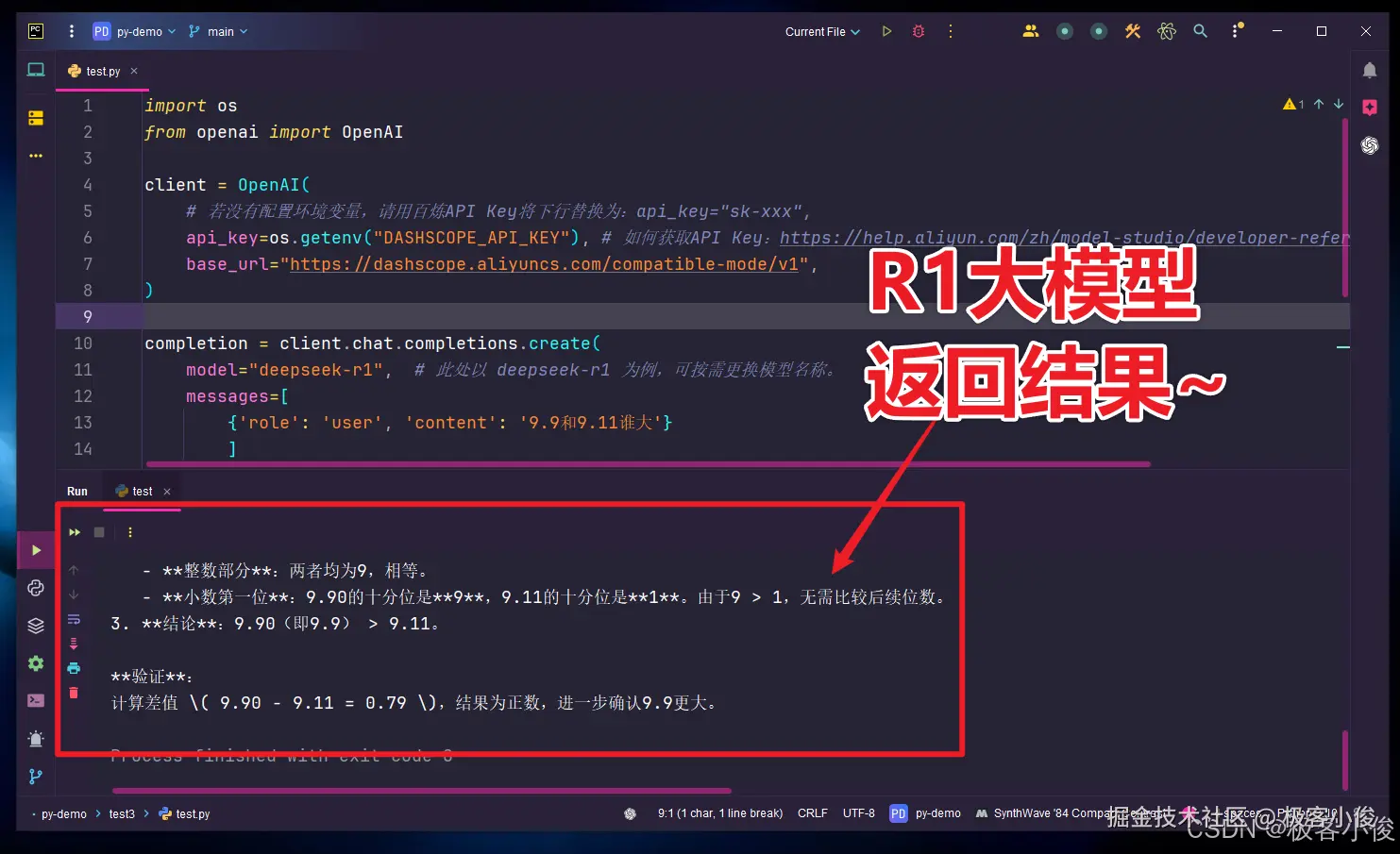 那么这就简单的实现了在本地PyCharm开发环境中,通过编程接口API对部署于云端服务的阿里云百炼平台的DeepSeek-R1大模型的远程程序化访问与调用!