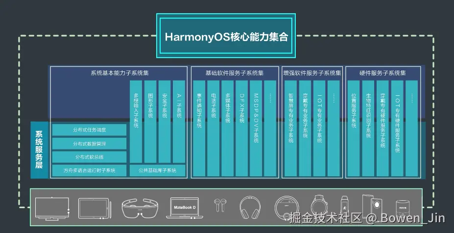 系统能力子系统为分布式App在HarmonyOS多设备上运行、调度、迁移等操作提供基础能力。该子系统由分布式软总线、分布式数据管理、分布式任务调度、以及公共基础库、多模输入、图形、安全、AI、方舟编译运行时等子系统组成