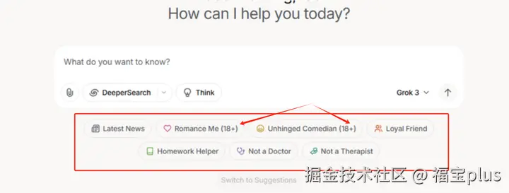 目前Grok本次上线了DeeperSearch、和七种角色扮演,本次主要来试试七种角色扮演。开始吧