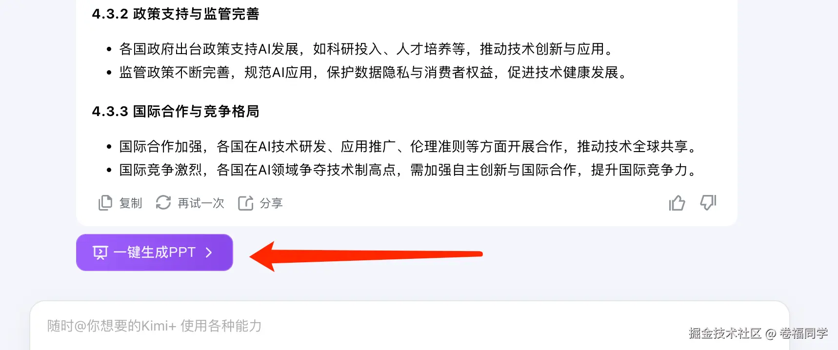 3.还是按之前的步骤,把拷贝的内容放到Kimi+的PPT助手中,然后把工作内容附件也一并上传,点击发送