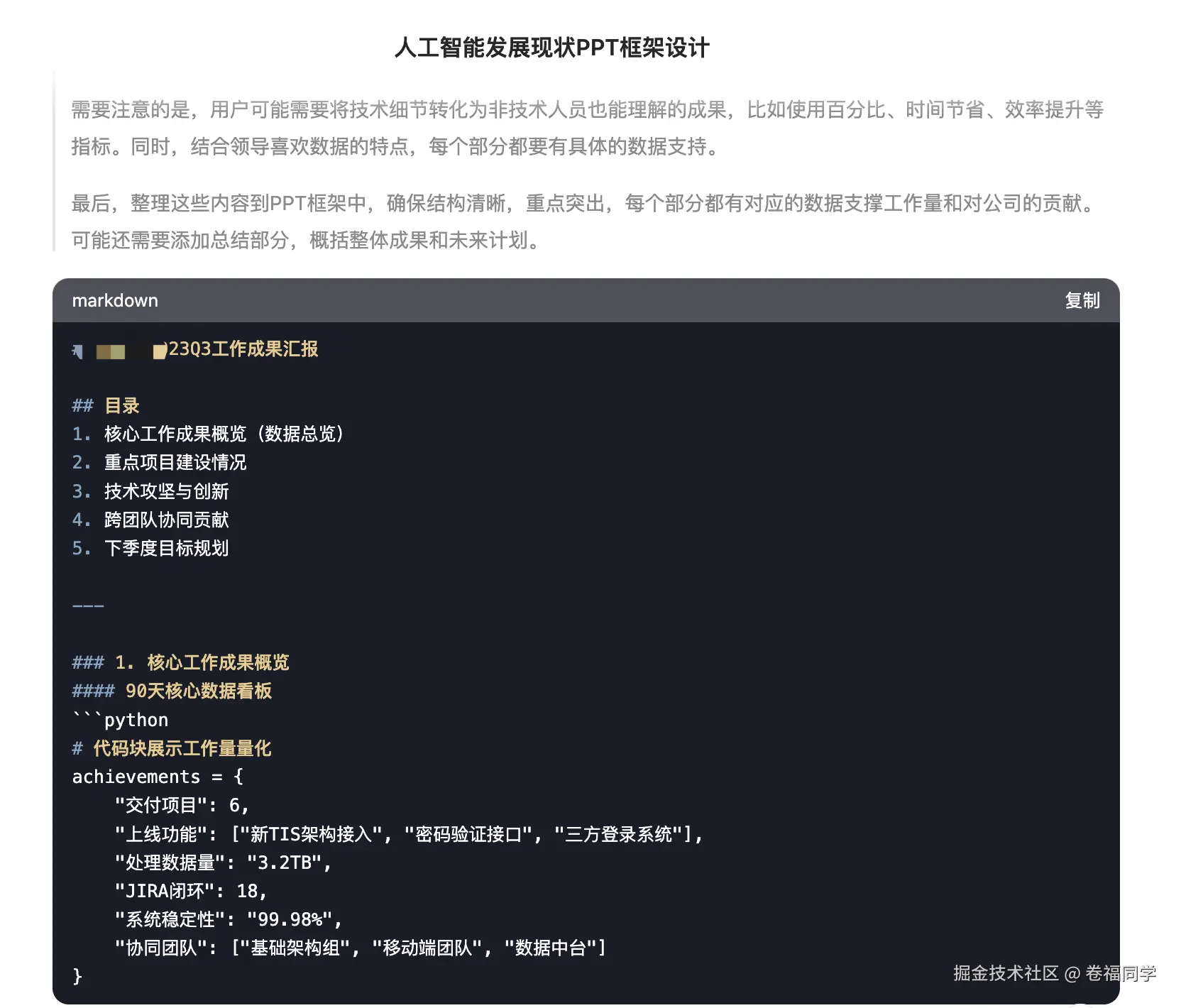 1.接下来给大家讲解如何让生成的PPT能用上自己的工作内容,提示词如下: