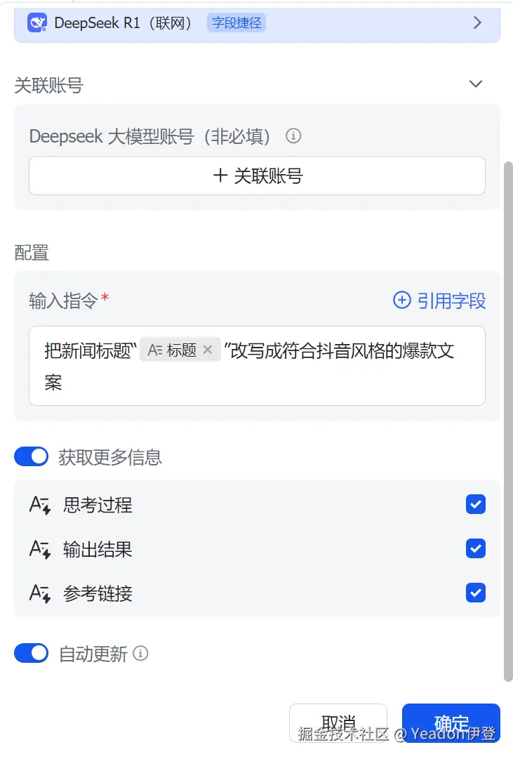 输入指令,并把标题字段引入作为参考,下方还可以获取更多信息包括推理过程以及输出结果等等