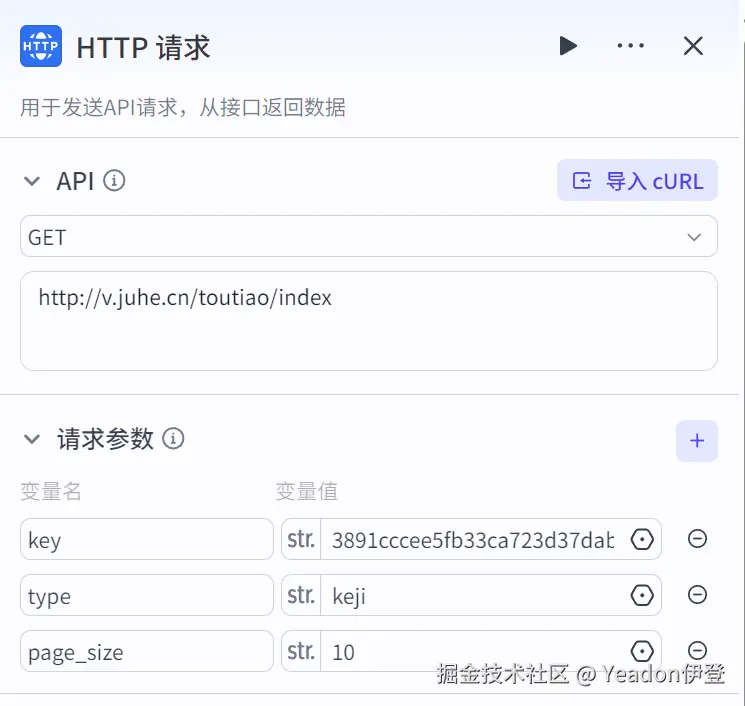 根据接口文档, 请求方式选择 “GET”, 接口地址填入 v.juhe.cn/toutiao/ind…。 重点来了! 请求参数设置!